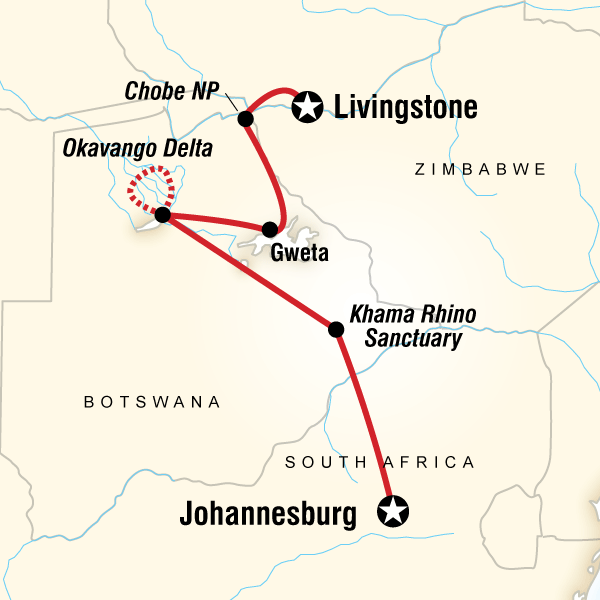 Approximate Distance: 200 km Estimated Travel Time: 3 hrs from Maun. Enjoy one last sunrise over the Delta, get up early for your last game walk, set out on foot to explore the delta area in search of game. Cruise back down the crystal clear channels of the Okavango Delta. We return to Maun to and continue our journey to Gweta. When the rain comes, it brings life to the pans, as it fills just a few centimetres awaking the dormant fish and aquatic shrimps from the mud. The surrounding grasslands also team with life and are home to an impressive number of antelope that attract a wide variety of predators. Makgadikgadi Pans National park was declared a game reserve in 1970, but in December 1992 it was enlarged and declared a national park. Today it comprises 4900 square km. It was initially state land. Although it is totally devoid of any water, people used to live there before it was declared state land. Villagers where allowed to graze their livestock inside the boundaries during dry season. Day 6 Approximate Distance: 420 km Estimated Travel Time: 6 hrs Today we journey to the area of Chobe National Park, home to the largest elephant population in Southern Africa. The best way to appreciate one of Botswana's national parks and its thousands of resident elephants, crocodiles, and hippos, is on an optional sunset boat cruise on the Chobe River. You may also choose to embark on a game drive in search of lions, antelope, and of course elephants. We camp on banks of the Chobe River, near its mouth. This is where the Chobe and Zambezi rivers meet, creating a border area of four countries – Namibia, Botswana, Zambia, and Zimbabwe. Chobe National Park is Botswana’s first national park, and is situated along the Chobe River. It has one of the largest concentrations of wildlife in Africa and one of the world's last remaining sizeable wilderness areas. By size, this is the third largest park (11,000 sq km) of the country, though it is definitely the most diverse and spectacular. The park is probably best known for its spectacular elephant population: with over 120,000 it has the highest elephant concentration of Africa. Moreover, most of them are probably part of the largest continuous surviving elephant population on Earth. During the dry season, these elephants sojourn in Chobe River and the Linyanti River areas. During the rain season, they make a 200 km migration to the south-east region of the park. Their distribution zone however outreaches the park and spreads to north-western Zimbabwe.