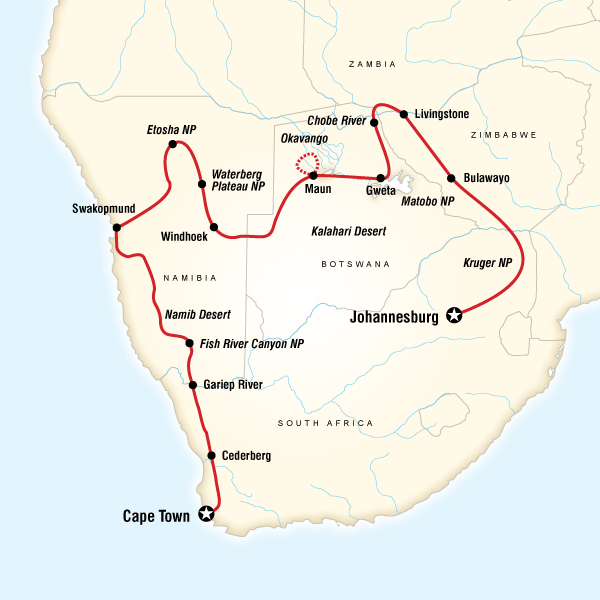 Day 2 Approximate Distance: 300 km Estimated Travel Time: 5 hrs Head out of the city to begin your overland journey, with a stop in the Cederberg area. Check out a local vineyard, sip on some wine, kick a footy around with the local kids, or explore the area near the camp in this beautiful part of South Africa. Day 3 Approximate Distance: 350 km Estimated Travel Time: 6.5 hrs Today we head north to the South Africa/Namibia border stopping on the South Africa side of the Gariep River. After setting up camp, enjoy a late afternoon swimming, relaxing, or possibly even canoeing on the river. The Orange River, in the past also sometimes known as the Gariep or as the Grootrivier, is the major river of South Africa. The river was first discovered by indigenous people but only explored by Europeans in 1760 and named after the House of Orange, which was the Stadhouder of Holland between 1777 and 1779. Another account of its naming suggests that it may have been called after the supposedly orangey colour of its water, as opposed to the colour of the water of the Vaal River (‘vaal’ being Afrikaans for pale or grey). Orange River, in sections, is a good diamond mining area. For thousands of years silt has washed down the river and produced diamonds on its banks. These diamonds also reach the sea and with long-shore currents (going northwards) and wind and wave action, they have been known to wash up on the shorelines.