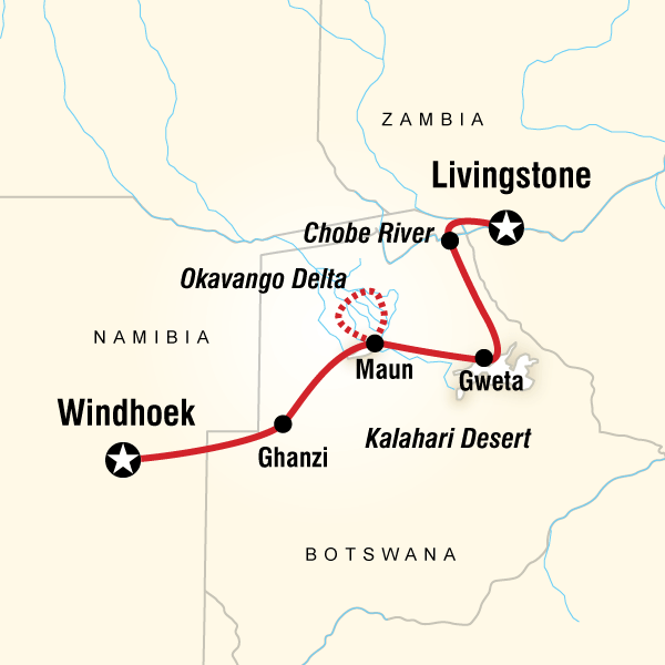 Approximate Distance: 580 km Estimated Travel Time: 8 hrs Today we continue through the eastern part of Namibia, and cross into Botswana and travel into the heart of the Kalahari. Get a glimpse of how the San adapted to the Kalahari Desert. Learn fascinating wilderness survival skills by local Bushmen on an optional Bushman walk. Ghanzi, located western part of Botswana on the northern rim of the Kalahari Desert, is the administrative center of Ghanzi District, and is also known as the "Capital of the Kalahari". Ghanzi is an intriguing town, and is primarily a farming community that supplies the Botswana Meat Commission with most of the required beef produce. In fact, it is the starting point of a 800 km long cattle trek—one of the longest in the world. Cattle are driven on horseback or by truck across the Kalahari southeastward to slaughterhouses at Lobatse. Ghanzi mostly consists of a variety of ethnic cultures for instance the Bushman, Bakgalagadi, Baherero, Batawana as well as Afrikaners. Other spellings include "Gantsi," which is more consistent with the national language of Botswana, Setswana, "Ghansi," and "Gantsi."