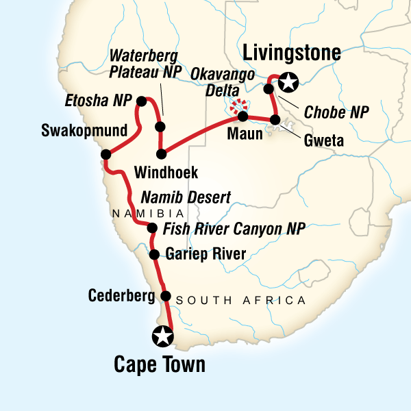 Arrive in Livingstone and make your way to the camp site. Attend a pre-departure group meeting with your CEO scheduled for the evening. Livingstone is a great base to see both natural wonders and take part in some exciting activities. Get up close (and wet from the spray) while awing at the immense Victoria Falls, raft the whitewater of the mighty Zambezi, and for the more adventurous, bungee jump with the Victoria Falls in view. Please note that the entrance fee to the Victoria Falls is not included in this tour. David Livingstone was born on March 19, 1813 in the village of Blantyre, South Lanarkshire, Scotland. He first studied Greek, medicine, and theology at the University of Glasgow and while working in London, joined the London Missionary Society became a minister. He originally planned to gain access to China through his medical knowledge. The Opium Wars, which were raging at this stage with no signs of peace on the horizon, forced Livingstone to consider other options. From 1840 he worked in Bechuanaland (present-day Botswana), and in the period 1852–56, he explored the African interior, and was the first European to see the Mosi-oa-Tunya waterfall, which he renamed Victoria Falls after his monarch, Queen Victoria. The Victoria Falls waterfalls occur in a country that is perfectly flat. From its source on the borders of the Democratic Republic of Congo, the Zambezi River meanders for 1300 km across the wooded plateau of Zambia, eroding for itself a shallow valley on its mild descent to the site of the falls. The river eventually found a weak spot on the lower lip of the surface over which it passed, and forced a passage which was steadily deepened into an exit gorge. During the last half million years the river has scoured out eight of these cracks across its bed. The Victoria falls occur where the river is 1688m wide, presents the spectacle of an average maximum of 550 million liters of water a minute tumbling over the lip of the trench in five main falls, the Devil’s Cataract, Main falls, Horseshoe Falls, Rainbow falls and the Eastern Cataract. The highest of these is Rainbow falls, on an average 108 m high. A peak flood sees 750 million liters of water in one minute hurtling over the falls. The name Zambezi comes from the Tonka tribe, also meaning Great River, but the Sotho-speaking Kololo people of the upper reaches of the river gave it the well-known name of Mosi o a Thunya (smoke that rises). The Lozi people call it by the same name but translated it into smoke that sounds. The Ndebele call it aManza Thunqayo (the water that rises like smoke). The Namibian people call it Chinotimba (a noise-making place like the distant sound of digging).