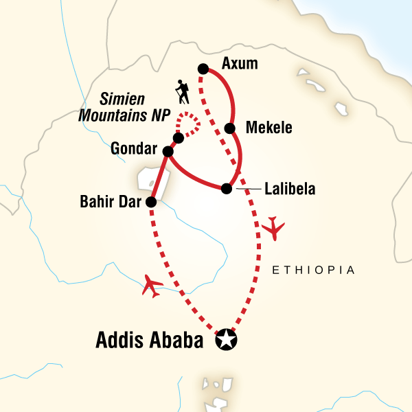 Estimated Travel Time: 1 hour flight time Approximate Distance: 1000 km After breakfast we transfer to the airport and fly from Axum to Addis Ababa. The tour ends upon arrival to your post tour hotel in Addis Ababa, please arrange ongoing travel after 3pm today.