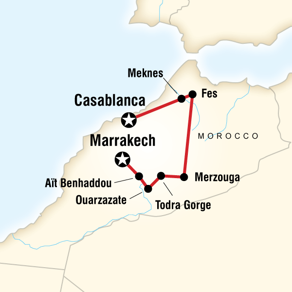 Arrive to Casablanca at anytime where a G Adventures representative will meet you at the airport to ensure a smooth arrival. There are no activities planned for the day, leaving you free to enjoy this beautiful city at your own leisure. With its art deco buildings, french colonial buildings, the Old Medina and its great restaurants and entertainment, there is plenty to keep you busy! We overnight in Casablanca.
