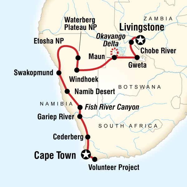 You will be dropped off at the hotel in Cape Town in the morning of day 7. Enjoy another two days in the metropolitan city before you start your adventure up to Livingstone. Attend a welcome meeting with your tour leader in the evening of day 8. There is no activity planned for those two days. Cape Town offers many different activities – something for everyone. Visit Robben Island, Table Mountain, explore Cape Point (Cape of Good Hope), embark on a wine tour in and around Stellenbosch (45min drive). Visit the old French Hugonote town of Franschoek and surroundings (1h drive). For the not so faint hearted there is numerous adrenaline activities in the surrounding areas, from skydiving to abseiling to cage diving and having a close encounter with the great white sharks. Or wonder through the city centre with some of the oldest buildings and gardens in South Africa (Botanical Gardens and Parliament Gardens). Do not miss the wonderful Cultural Historical Museum, Planetarium and numerous other small museums and theatres. Cape Town's name originated from the term 'Cape of Good Hope' when Bartholomew Diaz and other seafarers looked forward to the sight of Table Mountain, like an inn that promised hospitality and prosperity. The city is steeped in a rich history and is a cultural melting pot with its diverse and vibrant character being derived from Khoxisan and other African tribes from the North, and Indonesian, French, Dutch, British and German settlers. Cape Town is the third most populous city in South Africa, with over 3 million inhabitants, and is the provincial capital of the Western Cape. It is also the legislative capital of South Africa, where the National Parliament and many government offices are located. For shopping, dining and entertainment the V&A Waterfront is a hotspot for foreigners and locals alike. Still a working harbour, the Waterfront is an example of creative architecture and restoration and has become South Africa's most visited tourist attraction. The Waterfront offers over 250 shops from designer boutiques to craft stalls, a host of restaurants and coffee shops and plenty of other activities. For cultural exchange, you shouldn’t miss out a "Local Dinner” in a private home in an informal settlement. This authentic community experience provides guests the opportunity to get deep inside the heart of Cape Town. Choose from Cape Malay, Xhosa traditional or Cape Town fusion foods, and visit families in their private homes in townships and get insight into South African realities - be part of the family for an unforgettable night. Proceeds go into the community.