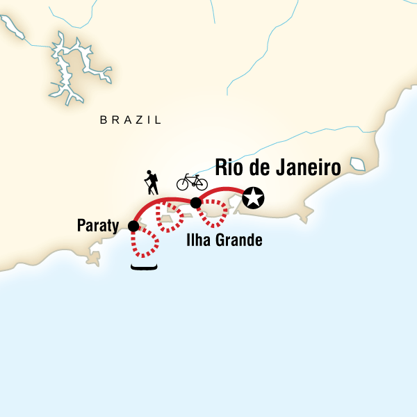 An early bird start in Rio as we catch the bus to head down Brazil’s Green Coast to the colonial town of Paraty. The trailhead is just outside the colonial town of Paraty. From here we head off into the unspoilt beauty of the Atlantic Rainforest on trails that will take us to some of the best beaches in Brazil. This is the car-free, tropical paradise of the Juatinga Peninsular Eco-Reserve and we spend 3 days crossing it on foot, staying overnight at remote fishing villages. On the first day we walk for about 3 hours stopping off for a typical local lunch of fresh fish, rice and beans on Sono beach before continuing on to the fishing village of Ponta Negra where we will spend the night. The next day we spend hiking the wild-side of the peninsular through dense rainforest to the fishing village of Pouso da Cajaiba where we will spend the night right on the beautiful sandy beach. This is a challenging day with 6 or 7 hours walking, much of it up and down steep hills. Fortunately we have a support boat that will meet us at the village with our backpacks. On Day 4, the last day of the hike across the peninsular, we set out early from Pouso da Cajaiba on our way to the Saco do Mamangua, Brazil’s only tropical fjord. We walk for about 6 hours on sandy beaches and trails through the forest with time for swimming at the beaches and a waterfall.