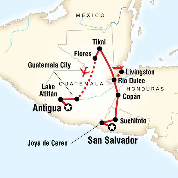 In the morning, board a motorboat and journey towards the coast on a beautiful ride past cliffs, hot springs and a few small communities. Journey in the afternoon overland to Flores in the Peten region of Guatemala. This charming town, with its pastel-coloured buildings, enjoys a scenic setting on Lake Petén Itzá. There will be time to stroll through the streets, buy local handicrafts or take a swim in the lake. We also have a day to visit the famous ruins of Tikal and the curious wildlife of the National Park. The city of Tayasal was transformed into the city of Flores, officially founded by the Spanish in 1700. It remained an isolated area, relying on the subsistence farming of corn and beans, and the gathering of chicle from nearby trees, used in the manufacture of gum. Despite the recent growth in Petén, Flores remains the same small island town, with narrow, cobblestoned streets, small, brightly painted houses and friendly people. The island is now attached to the mainland by a causeway, but many of the local inhabitants still get around by cayuco, or dug-out canoe. Flores remains one of the most scenic and charming towns in the Petén. It is particularly attractive to visitors because of Lake Petén Itzá, a large lake (12 km long and 3 km wide) offering all sorts of possibilities for fun, including swimming, boating, fishing and bird watching, a small zoo and a nature preserve. The sheer scale of the ruins at Tikal may at first seem daunting. Even if you make it only to the main plaza or spend an hour relaxing in deep contemplation, you certainly won't be disappointed. The central area, with its five main temples, forms by far the most impressive section. If you start to explore beyond this you can wander endlessly into the maze of smaller structures and outlying complexes hidden in the jungle growth. If your energy levels are high enough to make it to the top of Temple IV, your senses won’t be disappointed! Spectacular views of the surrounding jungle canopy will greet you from the top of the highest structure within the complex. Occasionally, you may spot toucans, macaws and other bright birds from this artificial perch within the greenery. Otherwise, you may simply marvel at the engineering and organizational skills needed to construct this city within the jungle! A local bilingual guide will explain the natural and artificial wonders of this site during our foray into Tikal. Estimated Travel Time (including excursions): 7 hours Approximate Distance: 300 km