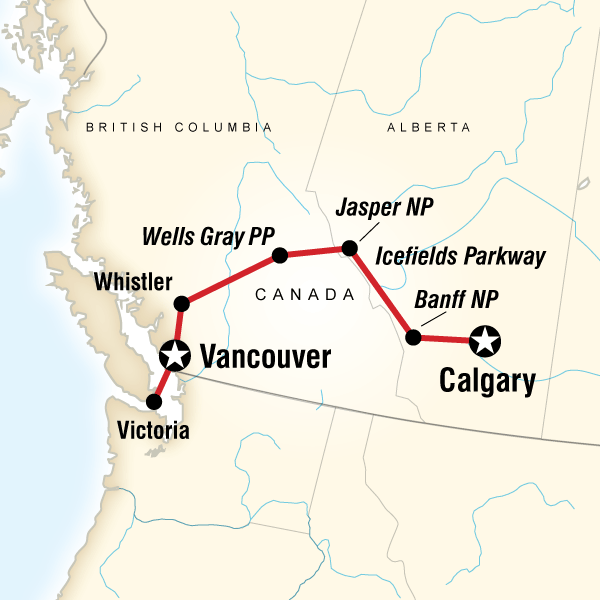 Considered one of the most scenic drives in the world, we travel the Icefields Parkway to Peyto Lake with a stop at the Columbia Icefield. Here we enjoy a glacier walk with an expert guide on the lower Athabasca Glacier to explore and understand the life of this active glacier. Continue to Lake Louise to view its emerald blue waters and Victoria Glacier. Take an orientation walk in Banff with the option for whitewater rafting, gondola or horseback riding. Travel along the celebrated Icefield Parkway to Jasper. Along the 300 km ride, a spectacle unfolds before our eyes: lush coniferous forests, immense mountains, turquoise lakes, high-falling cascades and humbling glaciers. Numerous stops will be planned along the way for photos, observation and wildlife encounters. At the Columbia Icefields, we enjoy a glacier walk with an expert guide on the lower Athabasca Glacier to explore and understand the life of this active glacier. Walking on this glacially carved landscape is an experience you won’t soon forget. Our last stop of the day is in Lake Louise, where we take time to savour the emerald blue waters and breathtaking scenery of Victoria Glacier. Walk along the lake or take a tea at the famous Chateau Lake Louise Hotel before continuing on to Banff. In the morning, we explore Banff area and enjoy optional easy walks: Visit Tunnel Mountain with a great view of the Bow Valley, the Banff Spring Hotel, the Bow River and the small Hoodoos. Drive around Lake Minnewanka and have the chance to observe some of the Rockies’ wildlife species: goat, black bear, deer or elk. Banff is always home to a good time and there is something for everyone either in its museums, shops and bars, along one of the hiking trails, or by choosing one of the many activities this park has to offer. One of these is Sulphur Mountain, which you quickly ascend by aerial tram. At its summit, you find an unobstructed view of the whole range and the village below. If you prefer an adventurous activity, the Kicking Horse River is the ultimate white-water rafting destination in the Rocky Mountains, guaranteed to provide the thrill of a lifetime. Or rent a canoe and enjoy the scenery from a calm section of the Bow River. Day 9 Approximate Distance: 290 km Estimated Travel Time: 10 hrs (including stops and Icefield Parkway)