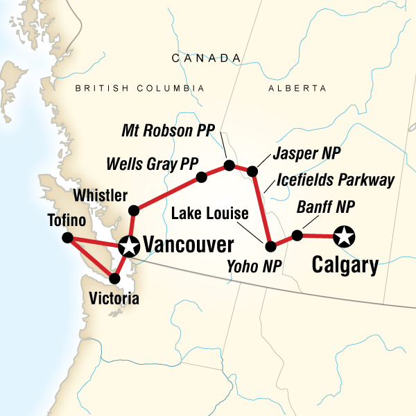 Towering walls of rock, spectacular waterfalls and soaring peaks earn the Yoho National Park its name; Yoho is a Cree expression of awe and wonder. Here in the shadow of the Great Divide are the secrets of ancient ocean life, the power of ice and water, and the stories of plants and animals that continue to evolve today. Visit the famous Emerald Lake, popular for sightseeing, canoeing and hiking. Then be in awe as you witness Takakkaw Falls, one of the highest waterfalls in Canada with a free-fall of 254 meters! In the afternoon take time for optional activities. Raft on one of the most famous rivers in Canada. The Kicking Horse River is the ultimate whitewater rafting destination in the Rocky Mountains guaranteed to provide the thrill of a lifetime. Not your thing? Visit the Kicking Horse Mountain Resort, home to the world’s largest enclosed and protected grizzly bear habitat. Visitors are given the opportunity, as part of a one-of-a-kind interpretive tour, to view a g rizzly bear interacting much as they do in the wild; foraging, hunting, playing, swimming, snoozing and exploring. Or visit the Northern Lights Wildlife Wolf Centre. It promotes wolf and bear conservation throughout the natural environment. This is a one of a kind opportunity to see these fascinating animals right in front of you! In the evening drive to Banff National Park. Return to camp in Lake Lousie. Approximate Distance: 100 km Estimated Travel Time: 8 hrs (includes Emerald Lake and Takkakaw Falls hike)
